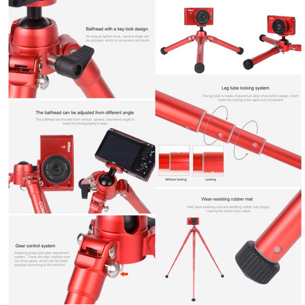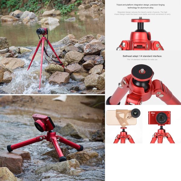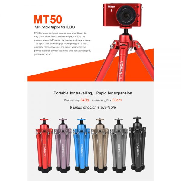 The COMAN MT50 tripod is a compact yet durable aluminum tripod with telescoping slide-out legs designed for low-angle shooting and bare-bones travel, supports up to 2.5kg. It collapses to just 230mm, with the ball head attached, and weighs just 0.54kg.