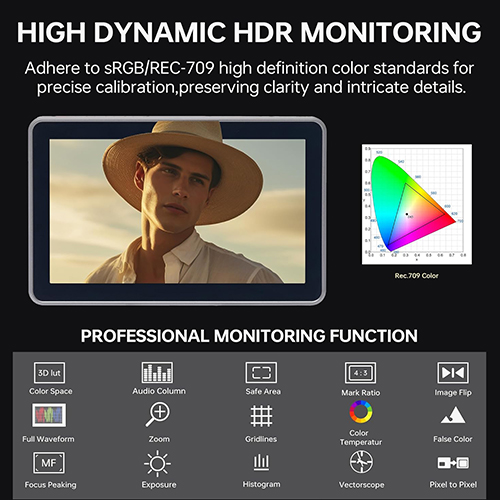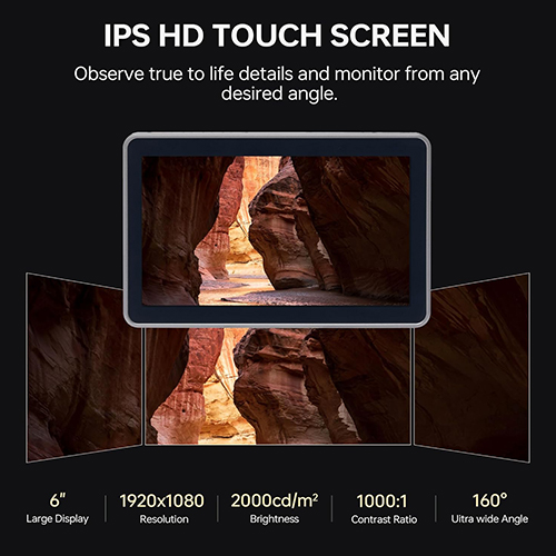 -Daylight-viewable, 6″ on-camera LCD monitor with 1920 x 1080 resolution